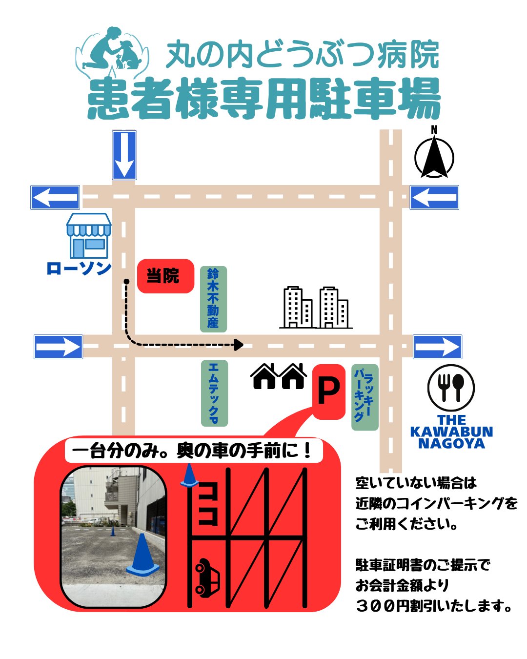 Google MAP「丸の内どうぶつ病院 患者様専用駐車場」と検索してください。→https://maps.app.goo.gl/vy7fQX2yTq9QqeFWA